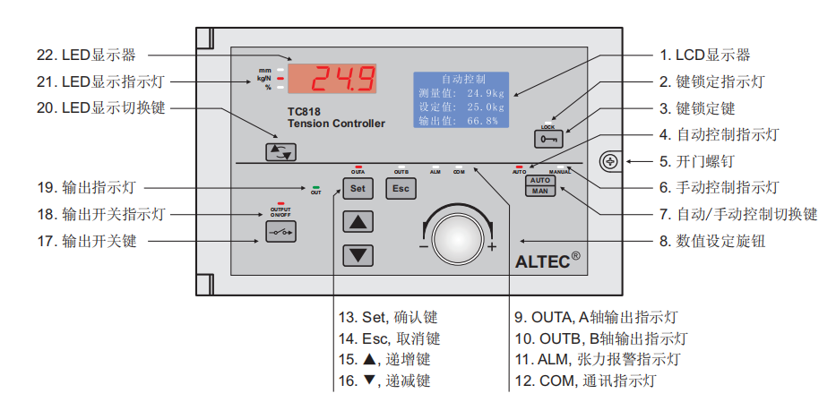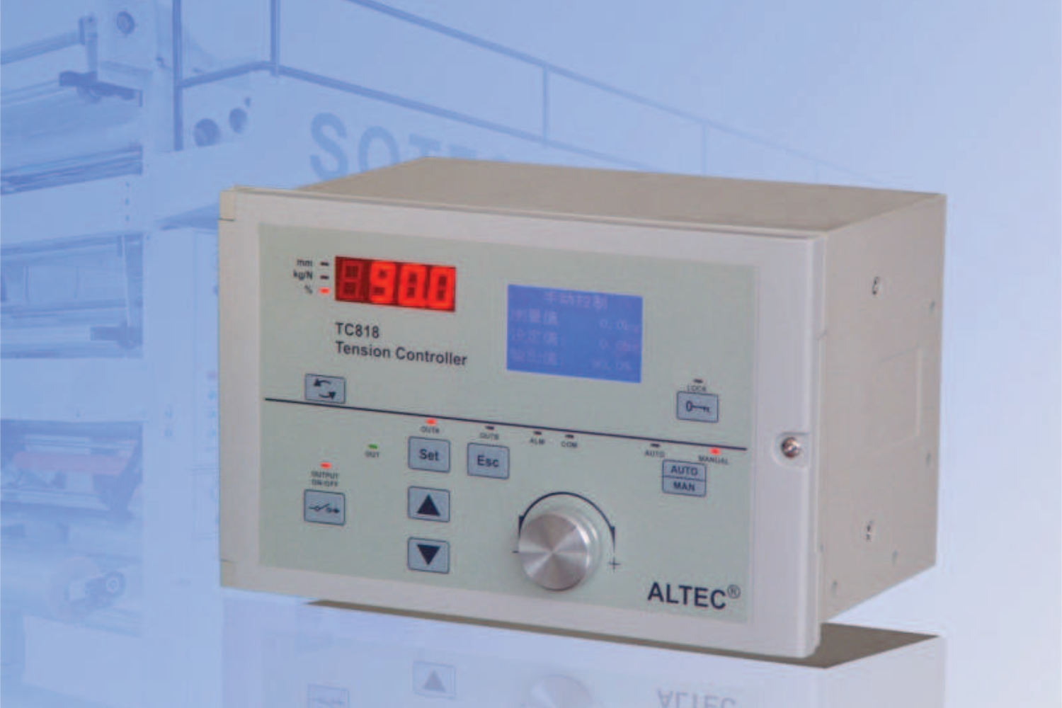 - 當(dāng)控制器工作在自動(dòng)控制模式時(shí),自動(dòng)控制指示燈AUTO)點(diǎn)亮,可旋轉(zhuǎn)數(shù)值設(shè)定旋鈕或按遞增鍵/遞減鍵修改張力設(shè)定值,按AUTO/MAN鍵可切換到手動(dòng)控制模式。