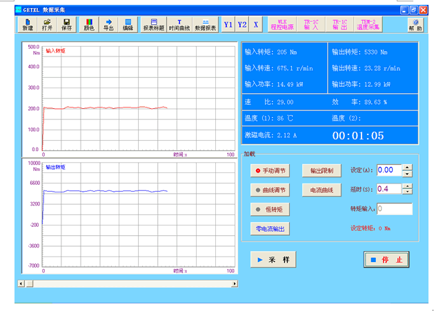 - 所有儀器通過(guò)RS485總線與電腦連接,實(shí)現(xiàn)對(duì)變速箱的自動(dòng)加載以及對(duì)數(shù)據(jù)的集中采集。實(shí)時(shí)顯示各參數(shù)與時(shí)間之間的關(guān)系曲線,以記錄整過(guò)測(cè)試過(guò)程。