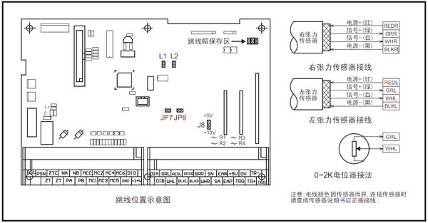 [3]在浮輥式張力系統(tǒng)中,當選用的角度傳感器為0~2KΩ點位器時,請將控制板上的跳線L1短接(為點位器提供恒流源),JP7,JP8短接。