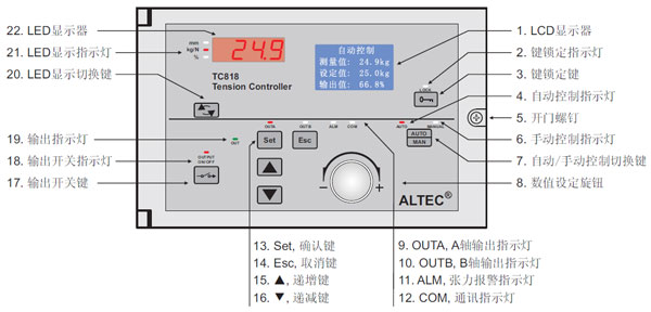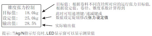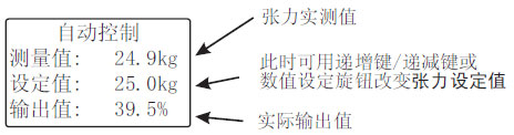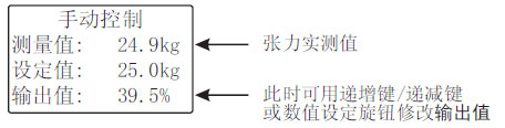 當控制器工作在自動控制模式時,自動控制指示燈(AUTO)點亮,可旋轉(zhuǎn)數(shù)值設(shè)定旋鈕或按遞增鍵/遞減鍵修改張力設(shè)定值,按AUTO/MAN鍵可切換到手動控制模式。